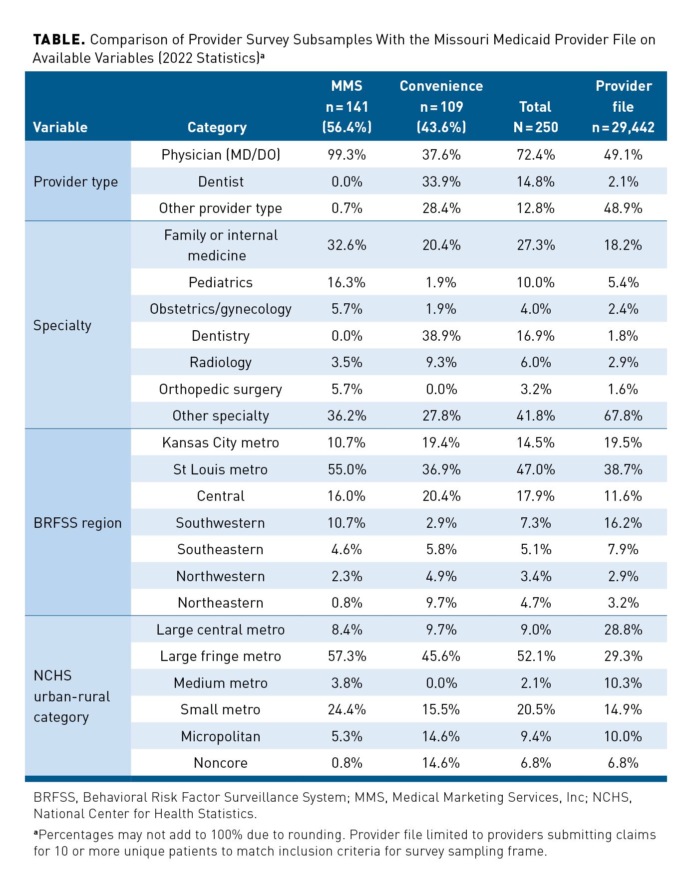 Provider recruitment included a convenience sample and a targeted probability sample from March to June 2023. The convenience sample included referrals from organizations and other providers based on their professional networks. The probability sample included state providers on the American Medical Association physician list through the vendor Medical Marketing Services, Inc (MMS), 7591 of whom met the inclusion criteria and were included in the sampling frame. Recruitment of both samples was limited to providers who saw at least 10 Medicaid patients in Missouri in 2022. In contrast to the interview recruitment, we did not restrict the survey samples by geography. The final sample size was 250 (141 MMS and 109 convenience). The response rate for the MMS probability sample was 1.9%, and the response rate for the convenience sample is indeterminate because the size of the sampling frame that received recruitment messages is unknown.