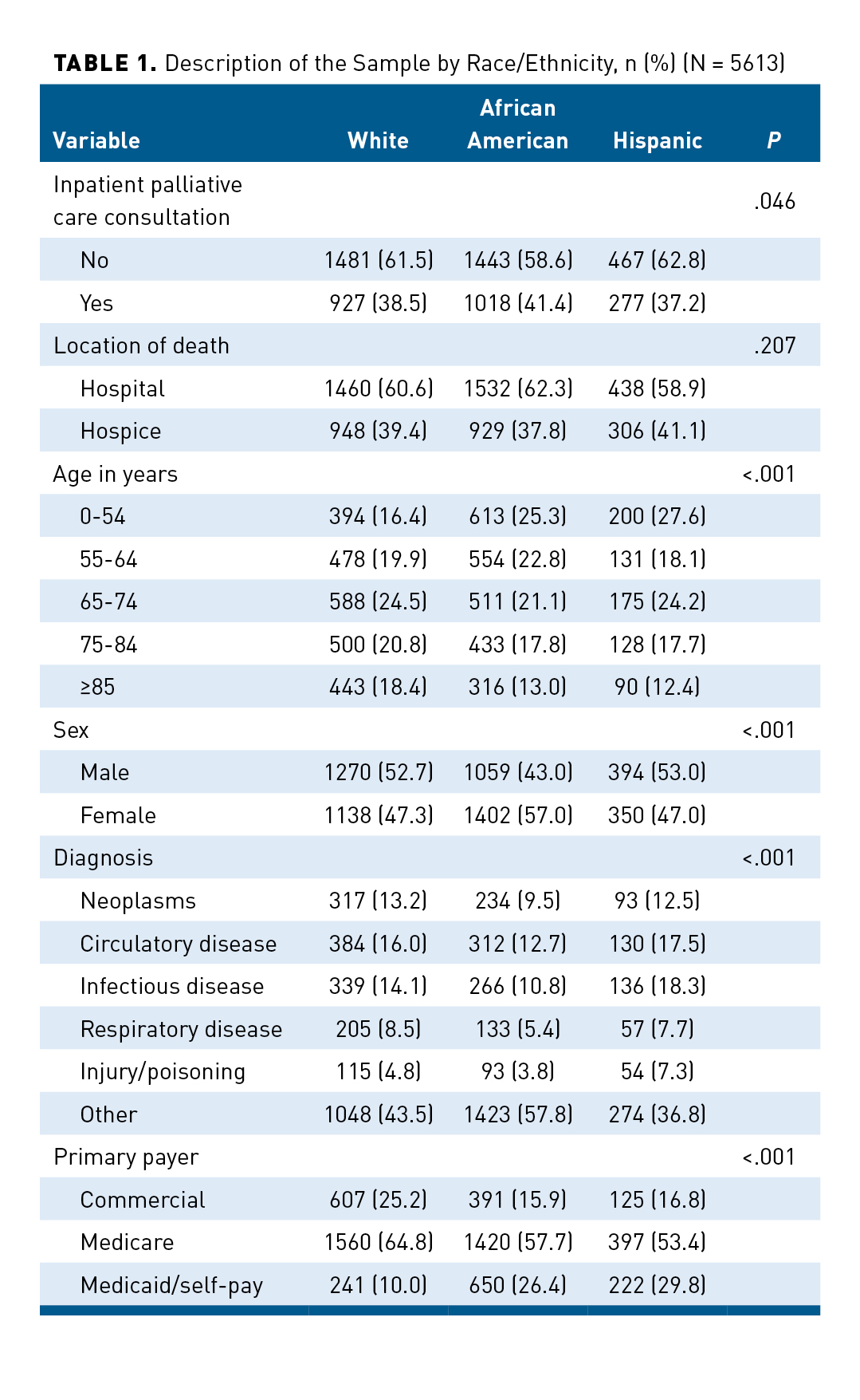 This study evaluated whether inpatient palliative care consultation use and discharge to hospice differed by race/ethnicity and whether hospital-level variations explained differences in 4 urban hospitals with an inpatient palliative care service.