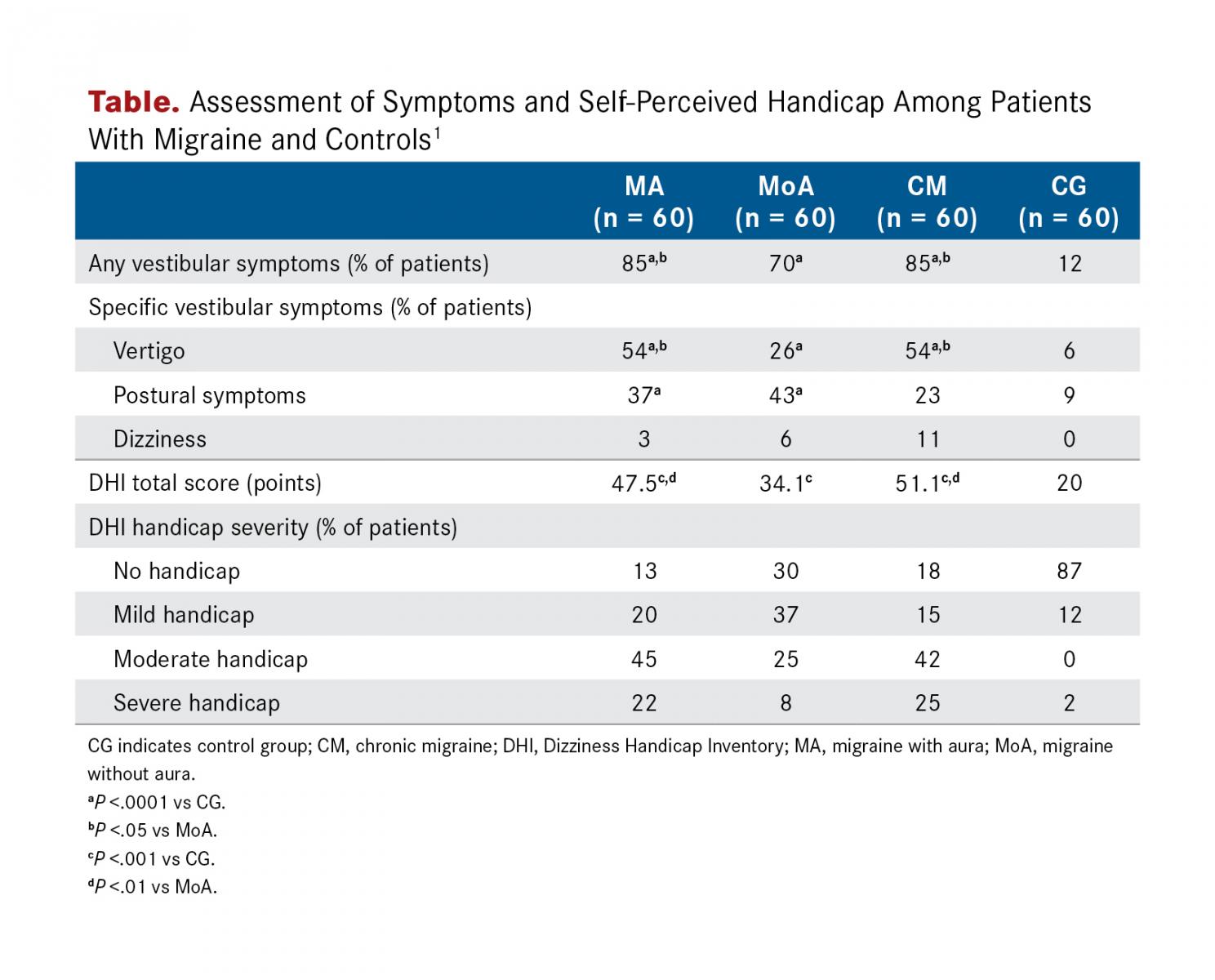 The investigators used a questionnaire to obtain information on patients’ demographics, migraine onset, pain intensity, attack frequency and duration, and presence and description of vestibular symptoms (during and between migraine attacks). The Dizziness Handicap Inventory (DHI) questionnaire, which is a validated tool to measure self-perceived handicap associated with vestibular symptoms, was also administered by a headache specialist.1