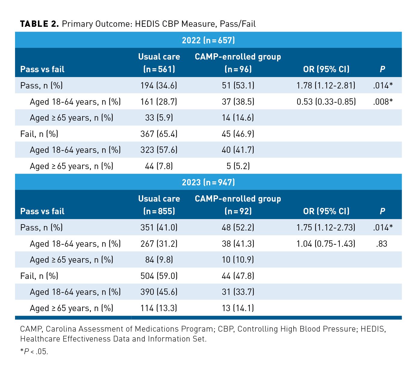 For the primary outcome, 1604 patients were included in the statistical analysis after accounting for missing confounders in the logistic model (2022: n = 657; 2023: n = 947). Across both years, patients in the CAMP-enrolled group demonstrated significantly higher odds of passing the HEDIS CBP measure compared with the usual care group (2022: OR, 1.78; P = .014; 2023: OR, 1.75; P = .014) (