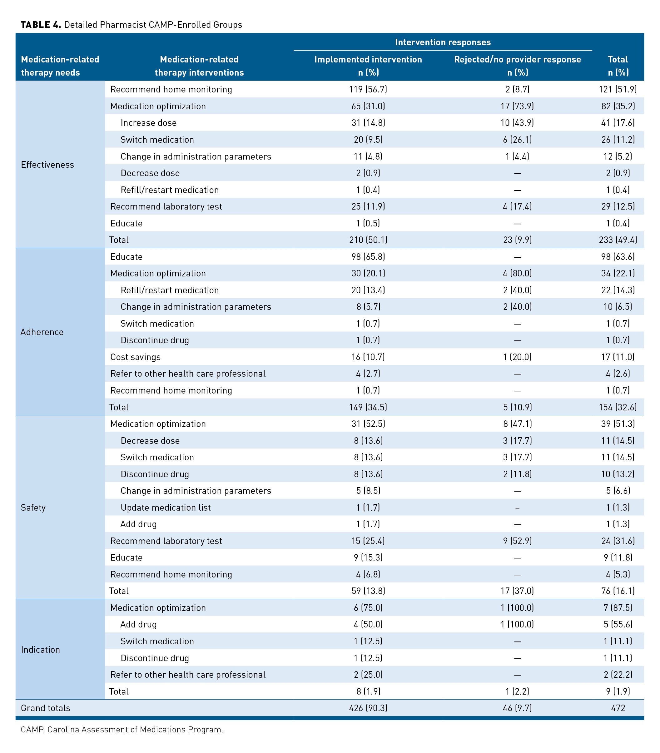 CAMP-enrolled patients had a mean of 2.93 visits with pharmacists, who made a total of 472 medication-related therapy interventions. The majority of these interventions addressed medication effectiveness (49.4%), followed by adherence (32.6%), safety (16.1%), and indication (1.9%). Among effectiveness-related interventions, HBPM was the most frequently recommended strategy (56.7%), followed by medication optimization (31%) and recommending a laboratory test (11.9%). HBPM recommendations were also commonly integrated into adherence and safety interventions. For adherence-related interventions, the most frequent recommendations were patient education (65.8%), medication optimization (20.1%), and cost-saving strategies (10.7%). Safety-related interventions primarily involved medication optimization (52.5%), recommending a laboratory test (25.4%), and patient education (15.3%). For indication-related interventions, the top recommendation included medication optimization (75%). Notably, across all intervention categories, medication optimization emerged as a unifying strategy, demonstrating consistently high rates of implementation and acceptance by providers (90.3%) (