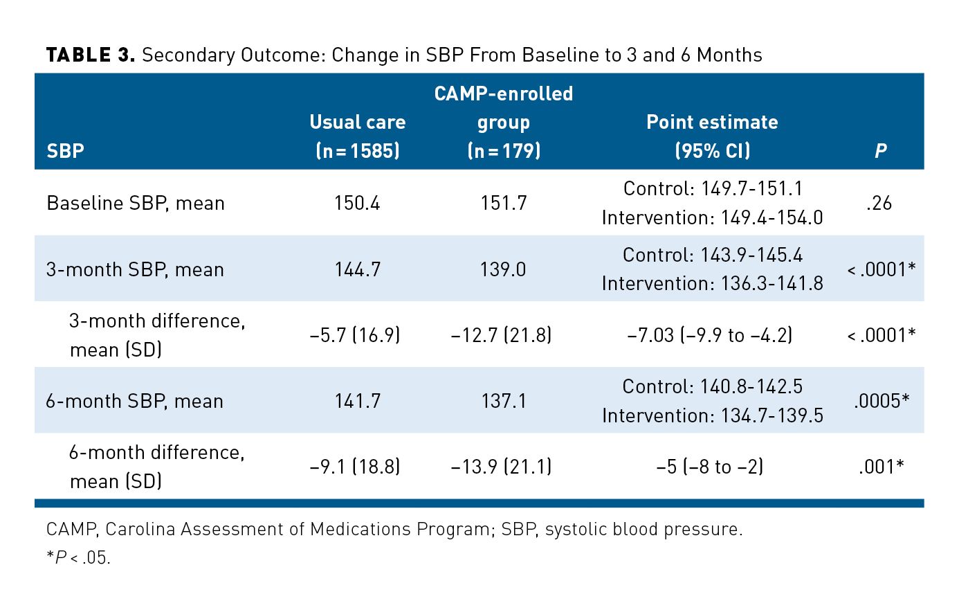 For the secondary outcome, 1764 patients were analyzed using a mixed model to evaluate changes in SBP and DBP from baseline to 3 and 6 months. Baseline SBP exceeded 140 mm Hg in both groups with no significant difference (151.7 vs 150.4; P = .26) (