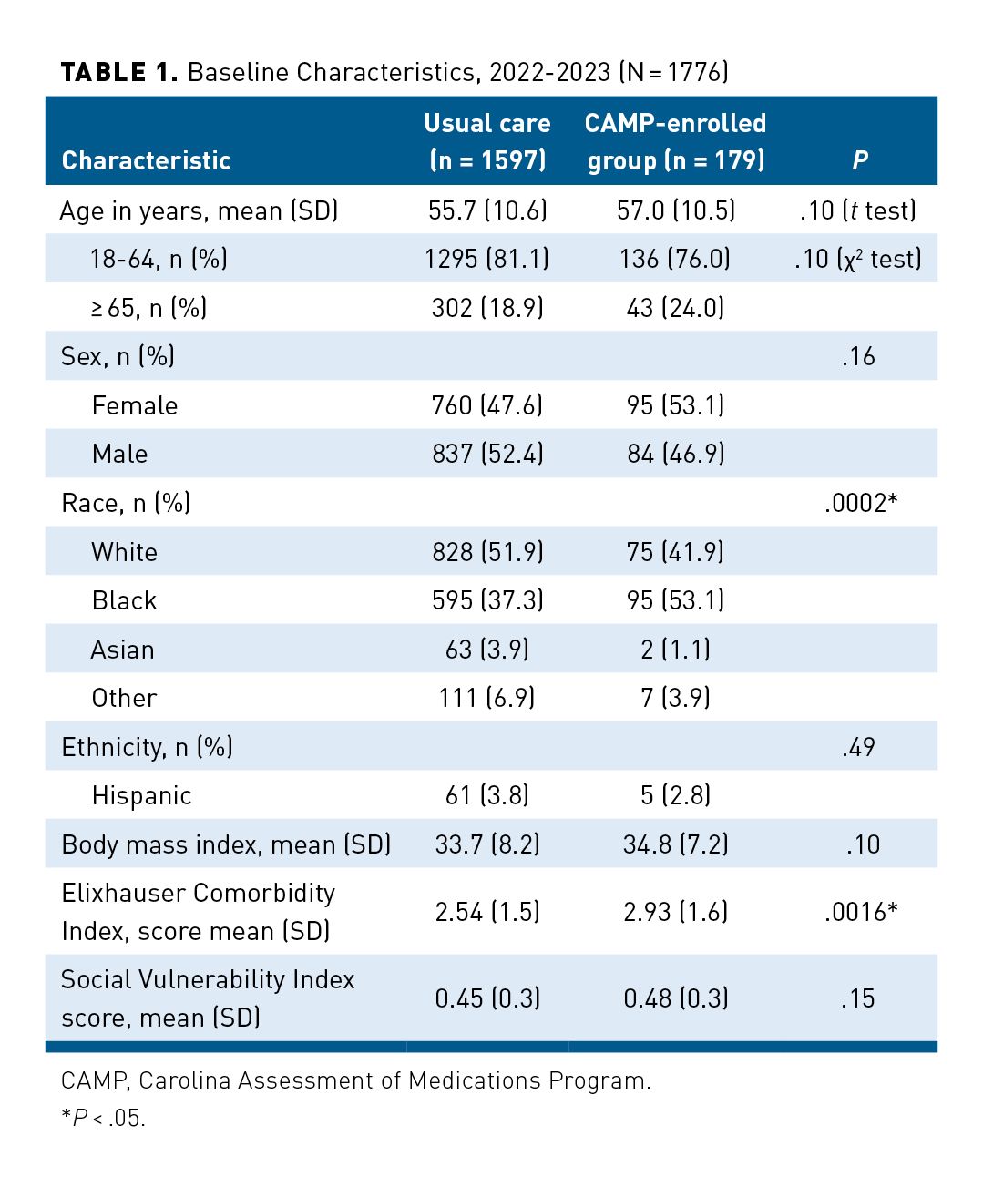 A total of 1776 patients met the inclusion criteria: 1597 in the usual care group (nonresponders and those who declined) and 179 in the CAMP-enrolled group (≥ 1 pharmacist telehealth visit). Patients referred to this service accounted for a small portion of patients. Twelve patients in the CAMP group (6.7%) and 5 patients in the usual care group (0.3%) were referred by a provider. Most patients were aged 18 to 64 years, consistent with a commercially insured population. Baseline characteristics were similar, except for a higher proportion of Black patients in the CAMP-enrolled group than the usual care group (53.1% vs 37.3%; P = .0002) and a higher mean Elixhauser Comorbidity Index score (2.93 vs 2.54; P = .0016) (
