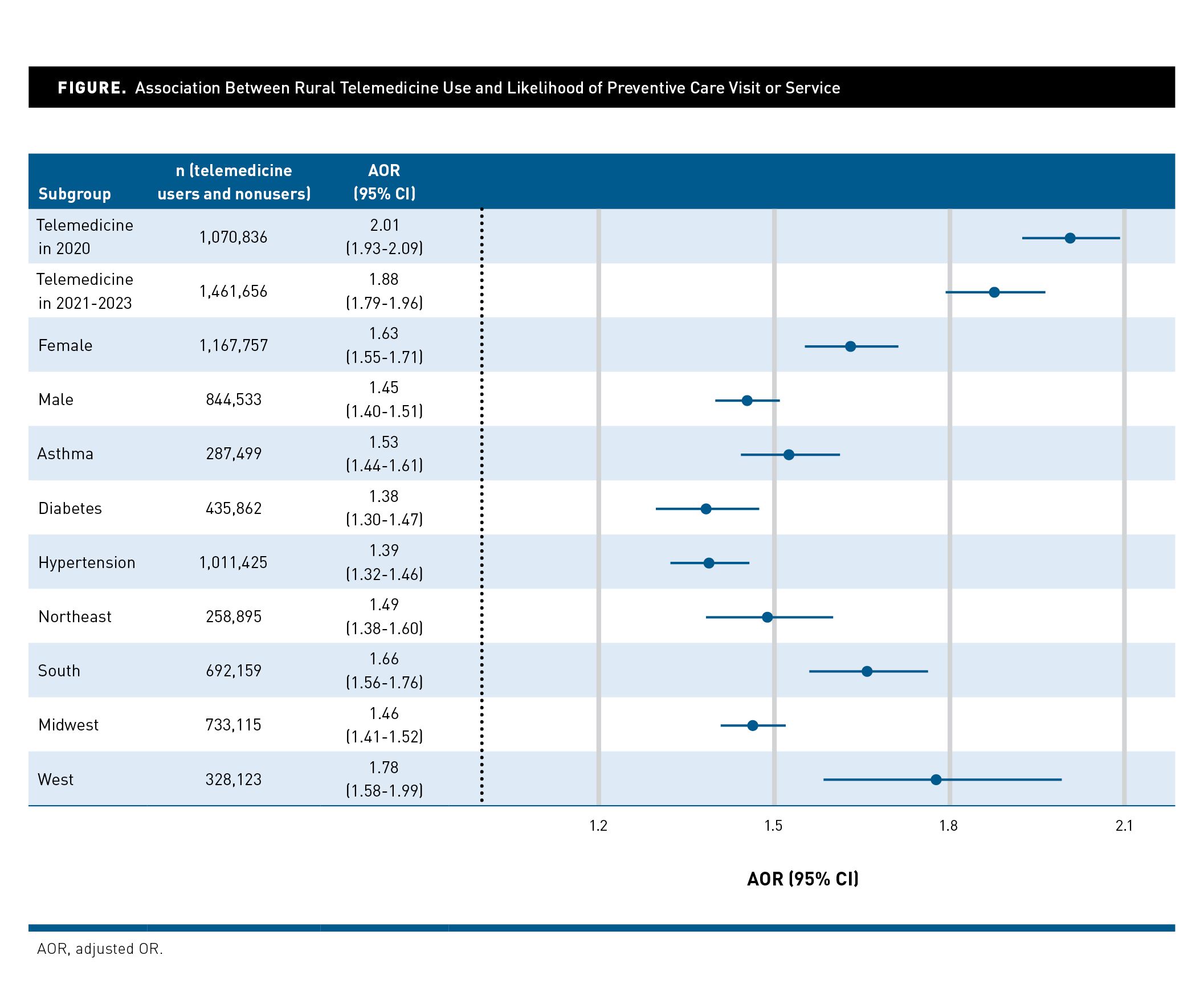 Individuals with asthma had a greater association between telemedicine use and preventive care (AOR, 1.53; 95% CI, 1.44-1.61) than those with diabetes (AOR, 1.38; 95% CI, 1.30-1.47) or hypertension (AOR, 1.39; 95% CI, 1.32-1.46). The relationship between telemedicine and preventive care was more pronounced among women (AOR, 1.63; 95% CI, 1.55-1.71) than men (AOR, 1.45; 95% CI, 1.40-1.51), as well as for individuals residing in the West (AOR, 1.78; 95% CI, 1.58-1.99) and South (AOR, 1.66; 95% CI, 1.56-1.76) compared with the Northeast (AOR, 1.49; 95% CI, 1.38-1.60) and Midwest (AOR, 1.46; 95% CI, 1.41-1.52).