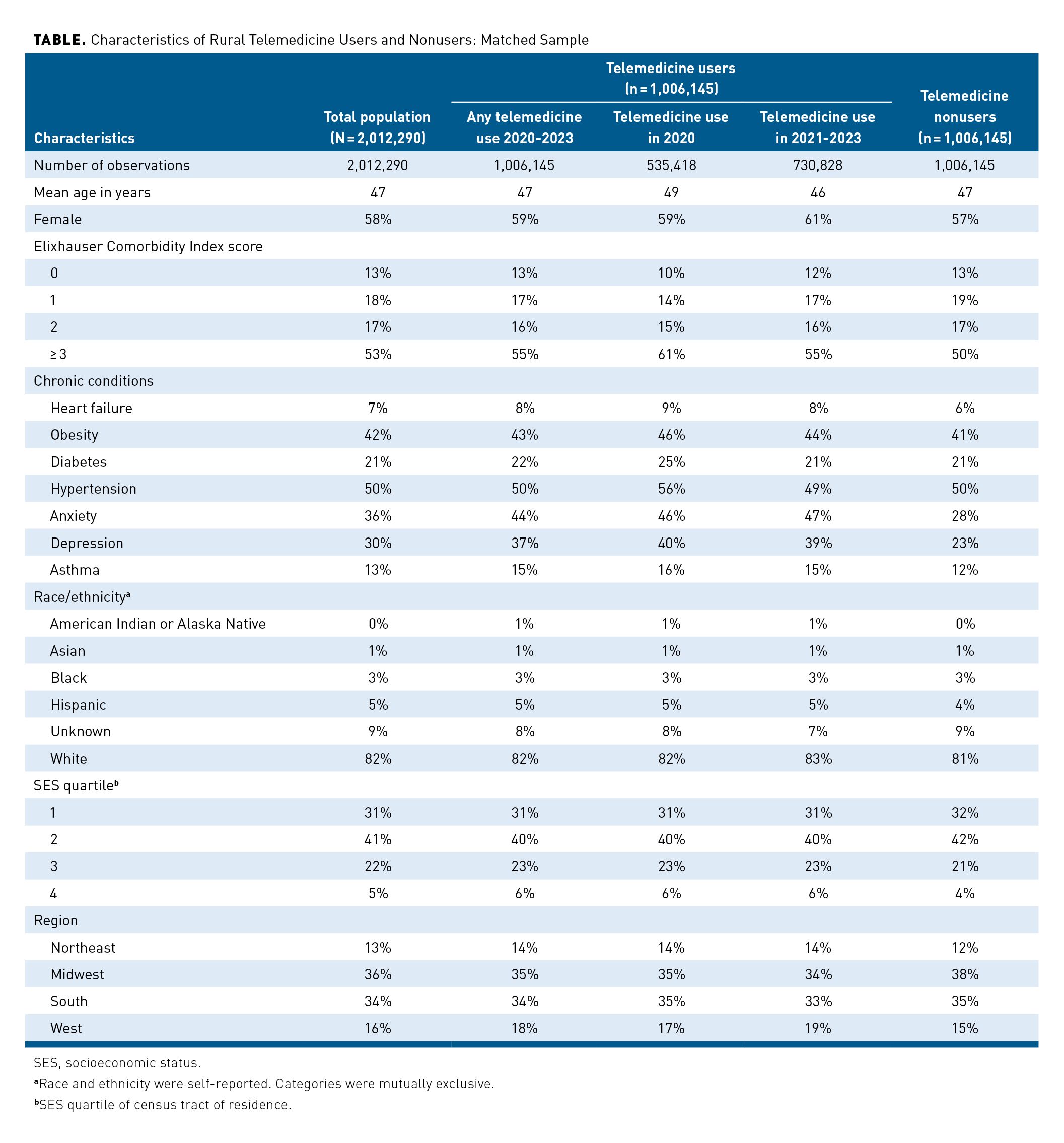 The matched sample consisted of 2,012,290 individuals residing in rural areas between January 2019 and December 2023. The sample matched moderately well (standardized mean difference, 0.16), with half of the study population (n = 1,006,145) comprised of those who used telemedicine during the study period: 535,418 in 2020 and 730,828 between 2021 and 2023 (