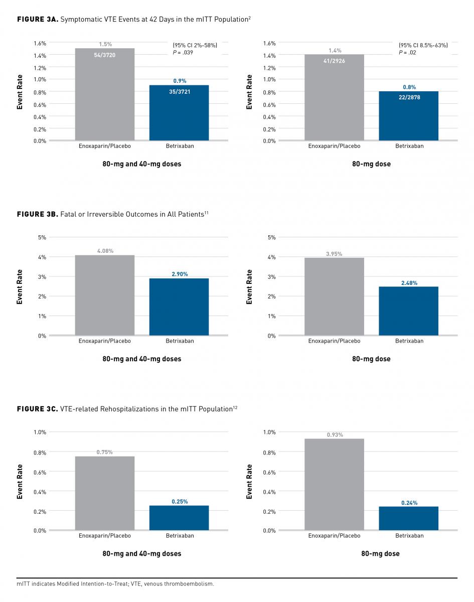 - When including patients from the mITT population who received only full dose betrixaban (80 mg), there were also significantly fewer VTE events with betrixaban compared with enoxaparin (4.2% vs 6.2%) (Figure 2B).1 The RR was 37.1% and the AR was 2%, with an NNT of 50.9