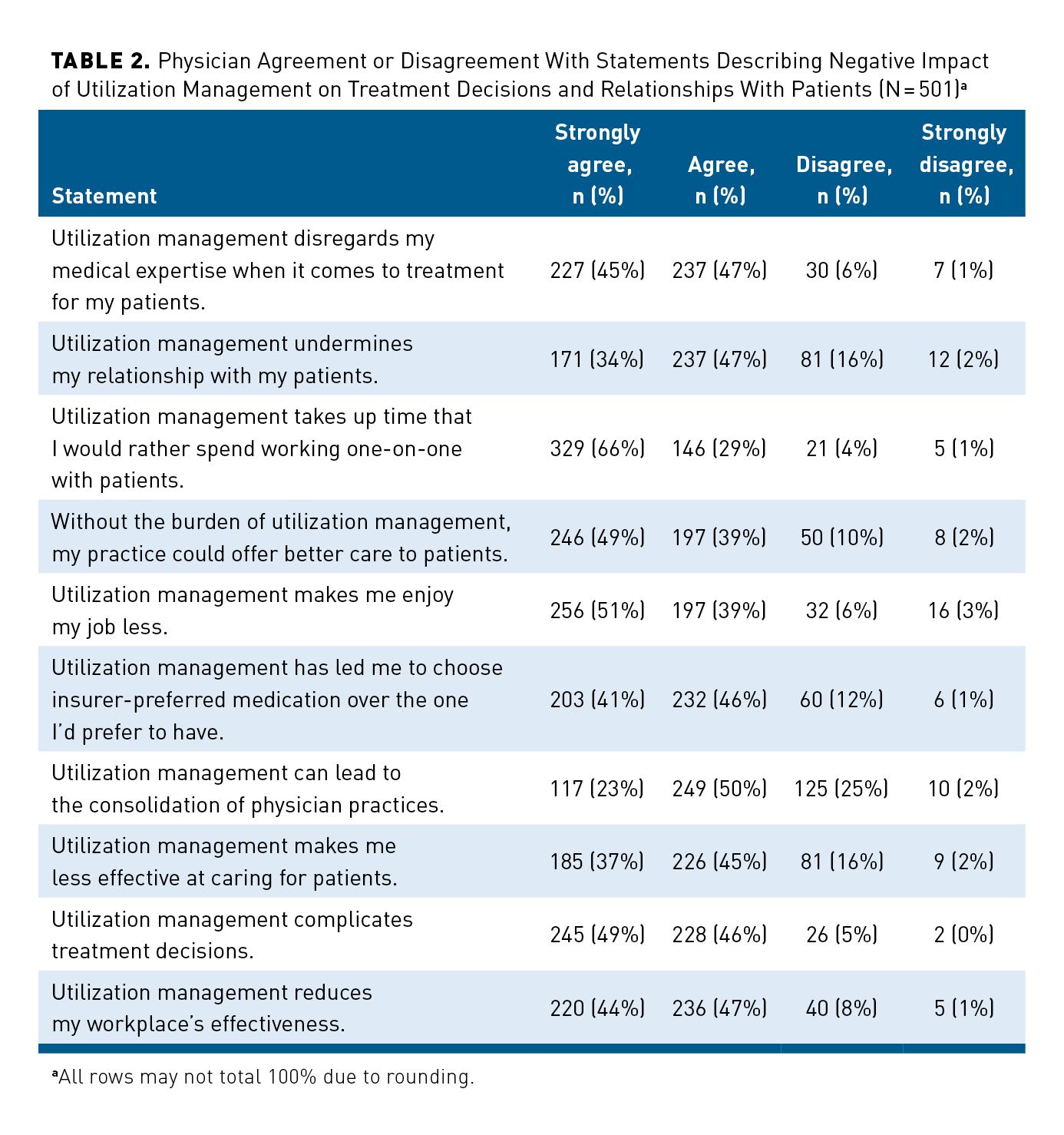 Most physicians agreed or strongly agreed with statements describing a negative impact of utilization management on their treatment decisions and relationships with patients (
