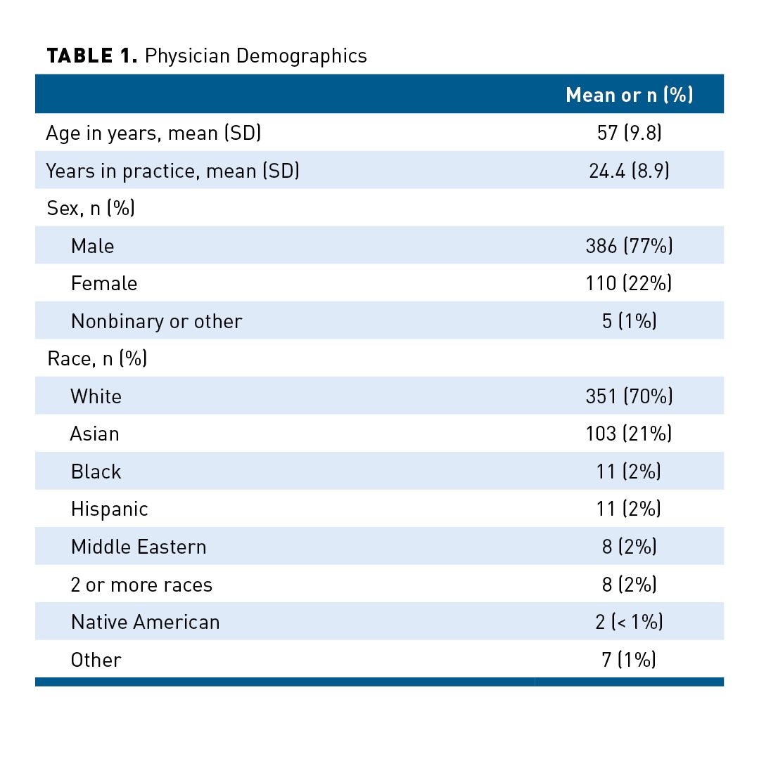 Of the 501 physicians, 200 were general practitioners and 301 were nonhospital specialists. Most were in family/general medicine (40%), followed by ophthalmology (14%), dermatology (12%), gastroenterology (10%), endocrinology (9%), urology (6%), otolaryngology (5%), and rheumatology (5%) (percentages do not sum to 100% due to rounding). Per inclusion/exclusion criteria, all physicians worked in the outpatient setting. Most physicians had been practicing between 15 and 35 years (74%) and 14% had been practicing for 35 years or more. Three-fourths (76%) of physicians indicated that their workplace was privately owned, 21% said their workplace was owned by the local hospital system, and 3% noted they were in workplaces with other ownership. Just over half (51%) worked in clinics that employed 20 people or fewer, 24% in clinics with 21 to 50 people, and 25% in clinics with more than 50 people. Most physicians were male (77%) and White (70%), with 77% aged 40 to 65 years and 19% older than 65 years (